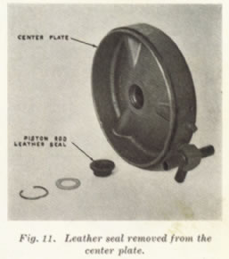 13. Remove the piston rod leather seal from the center plate. This seal is held