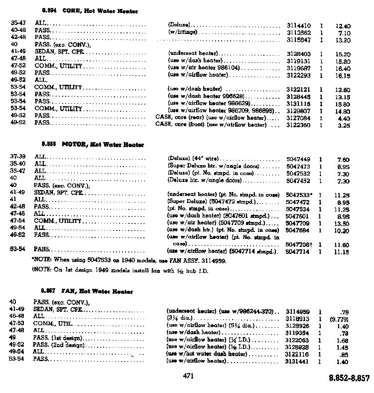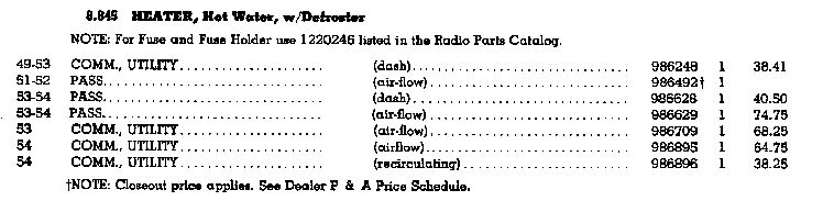Note that for the war time years there is only one heater core and motor that is NOT specifically for